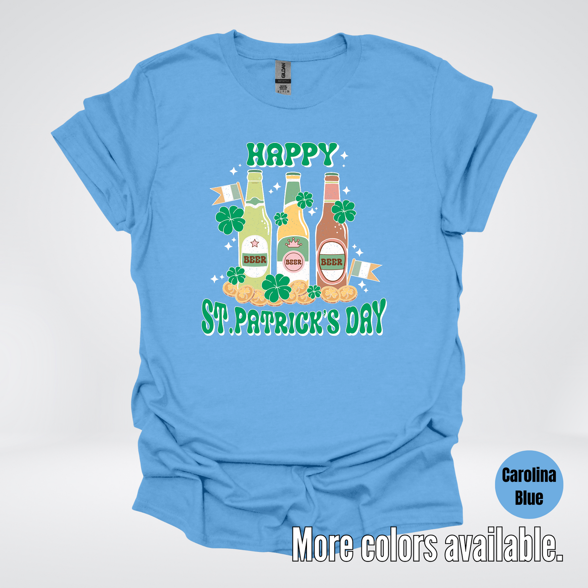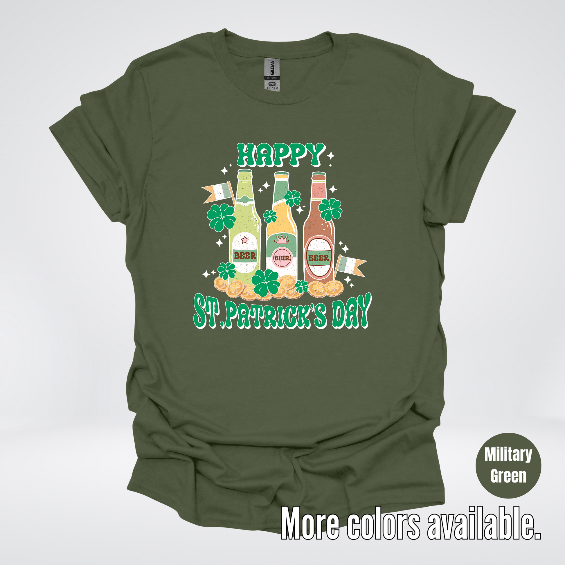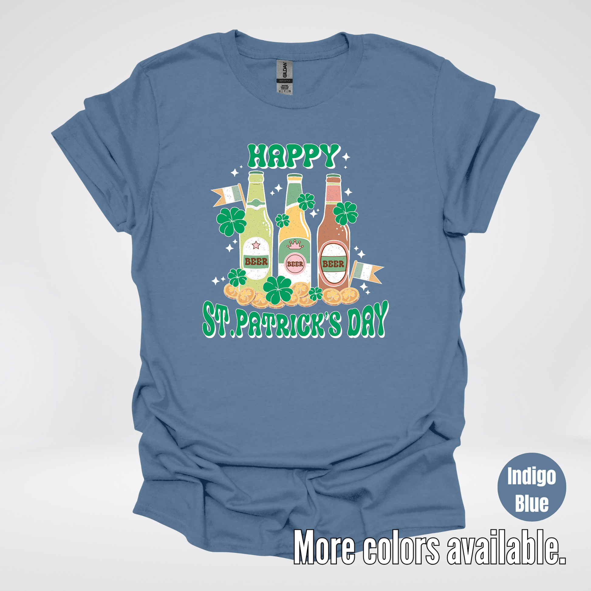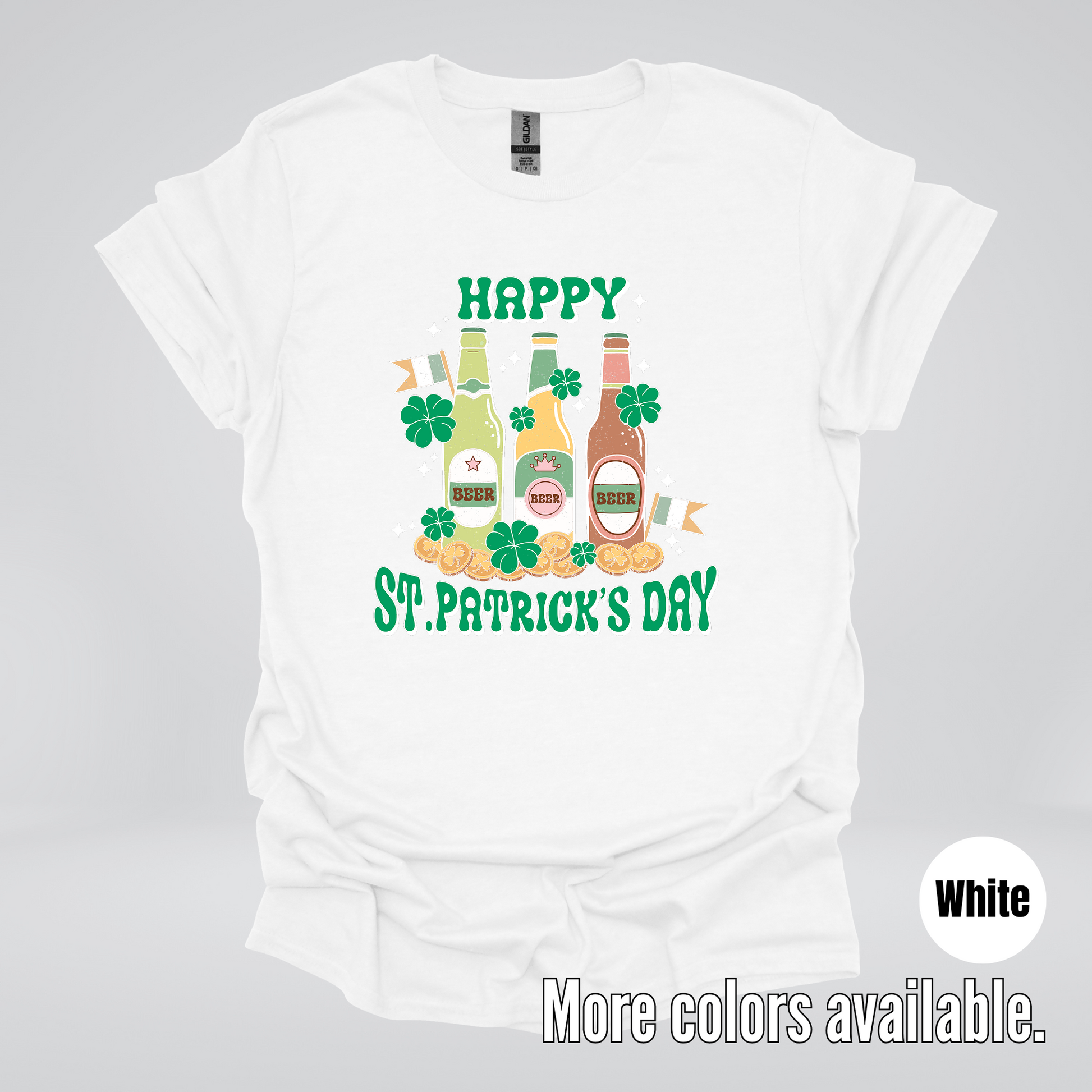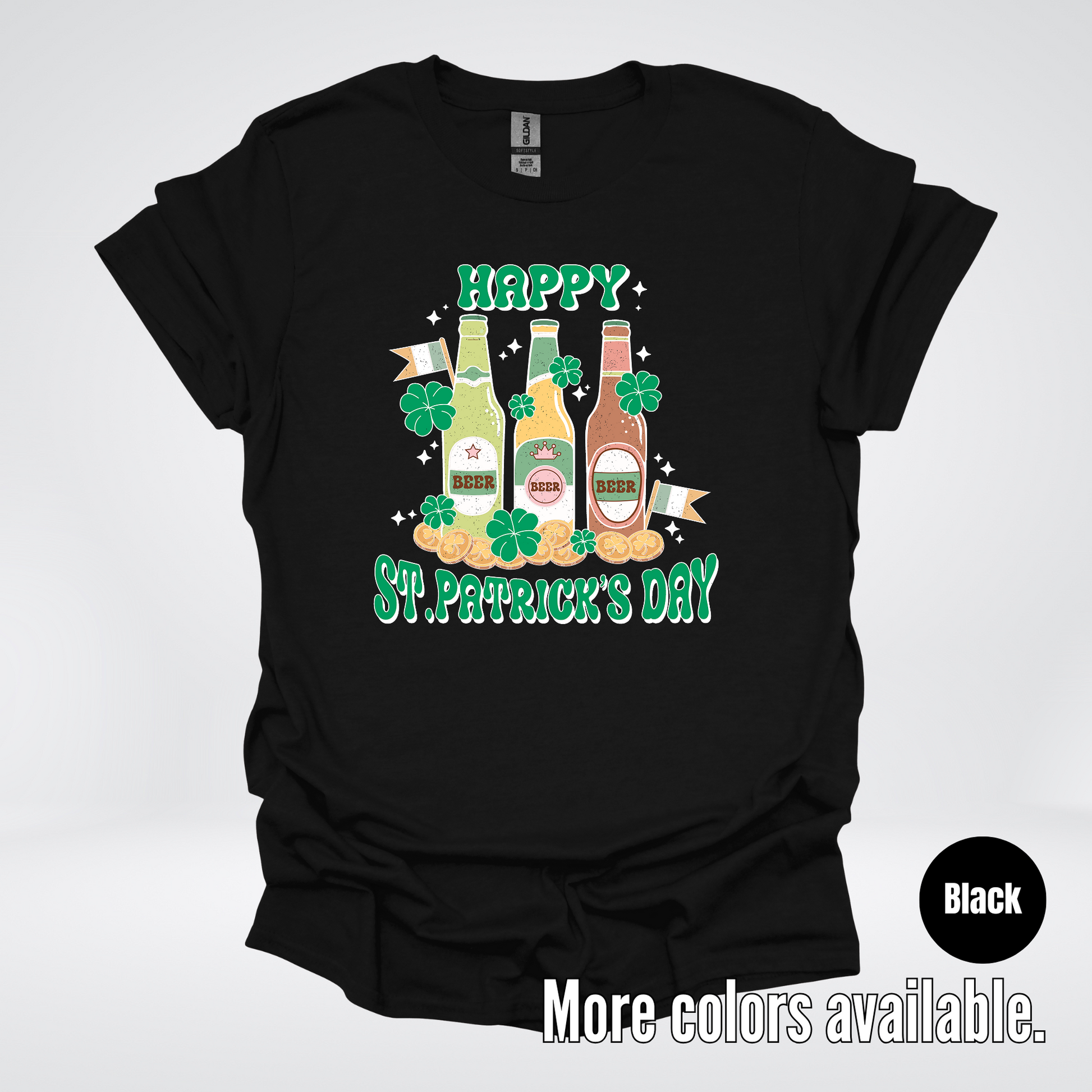 Celebrate Saint Patrick's Day in style with our Three Bottles Saint Patrick's Day T-Shirt! This playful and quirky shirt features three beer bottles, gold coins, the Irish flag, and four leaf clovers. Perfect for those who don't take themselves too seriously, this shirt is sure to bring some fun to your holiday festivities. Cheers to a lucky and enjoyable St. Patrick's Day!
