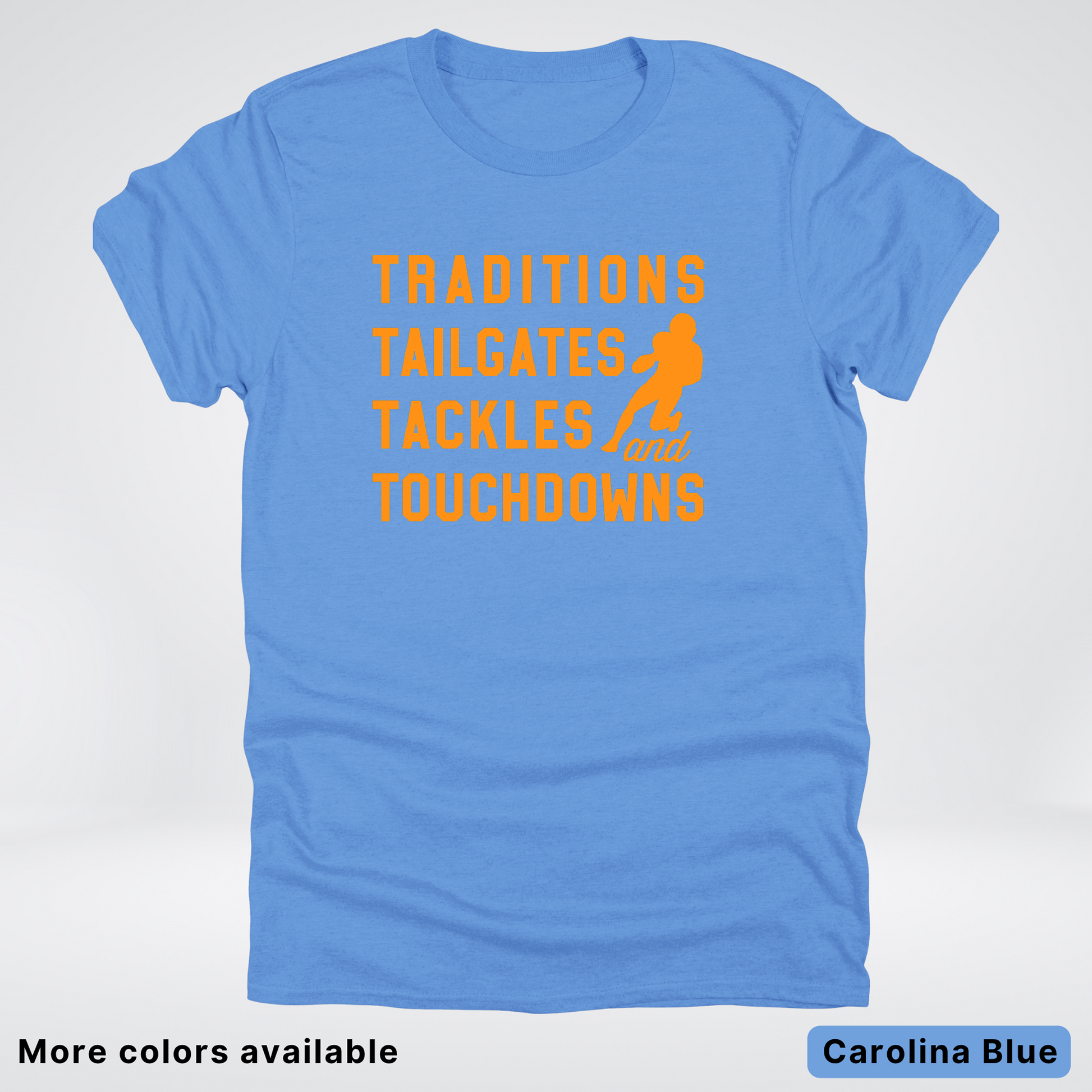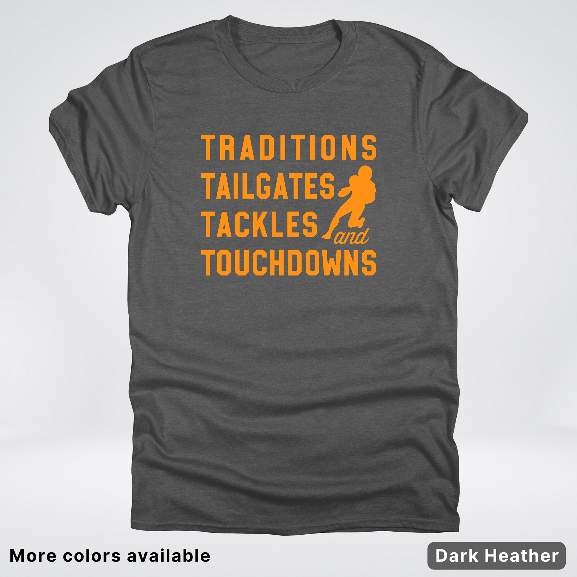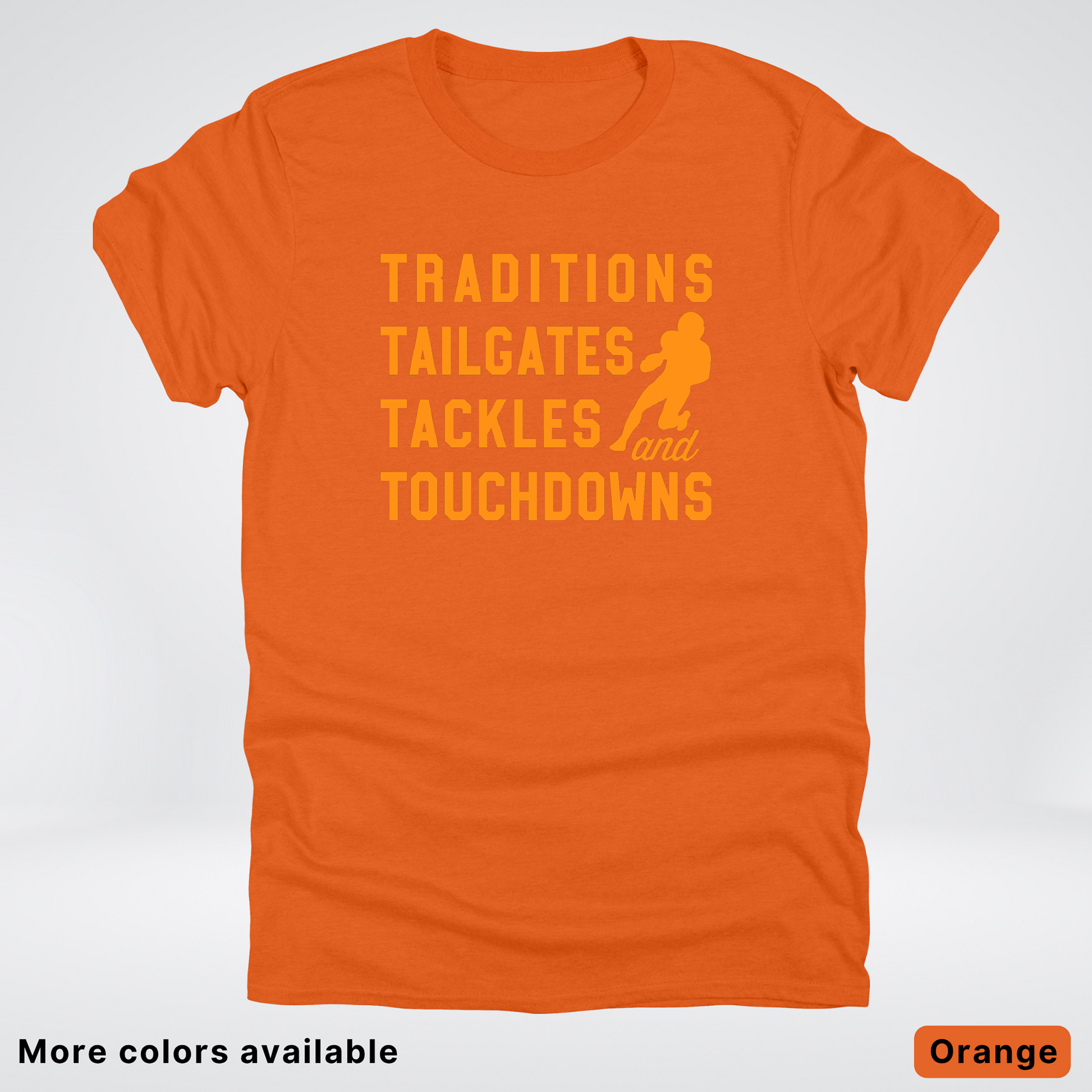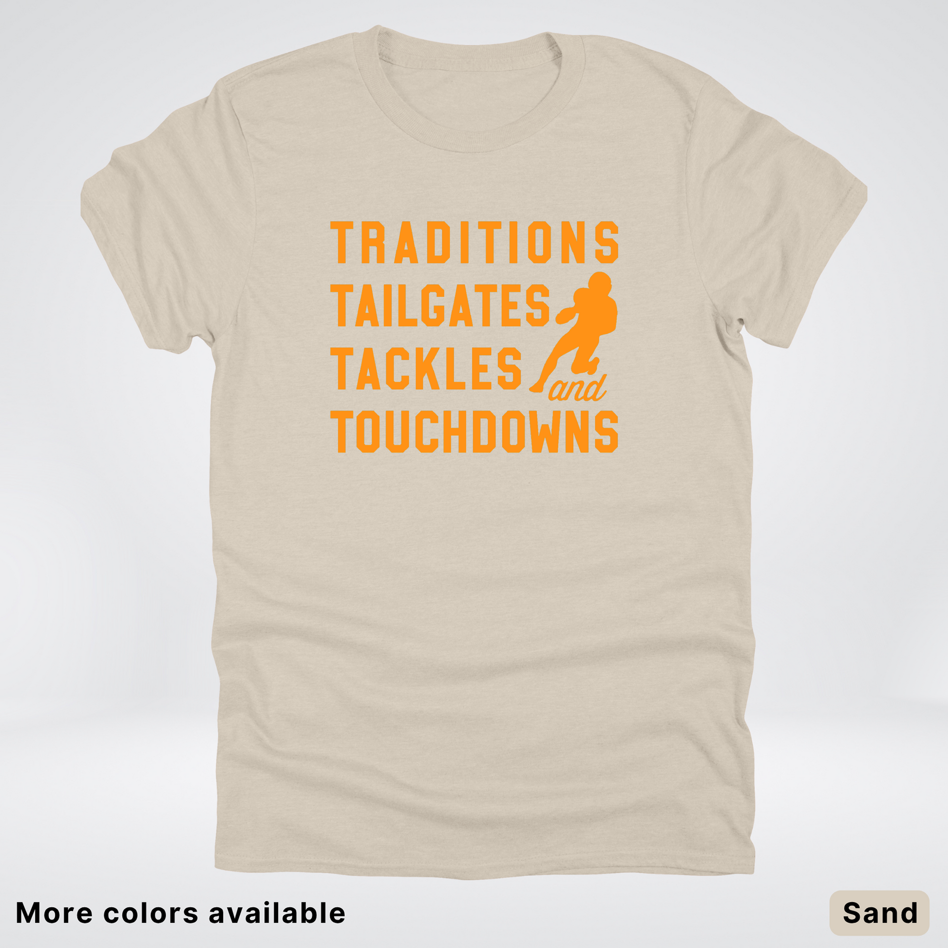 Traditions Tailgates Tackles and Touchdowns – Orange Design - Football T-Shirt