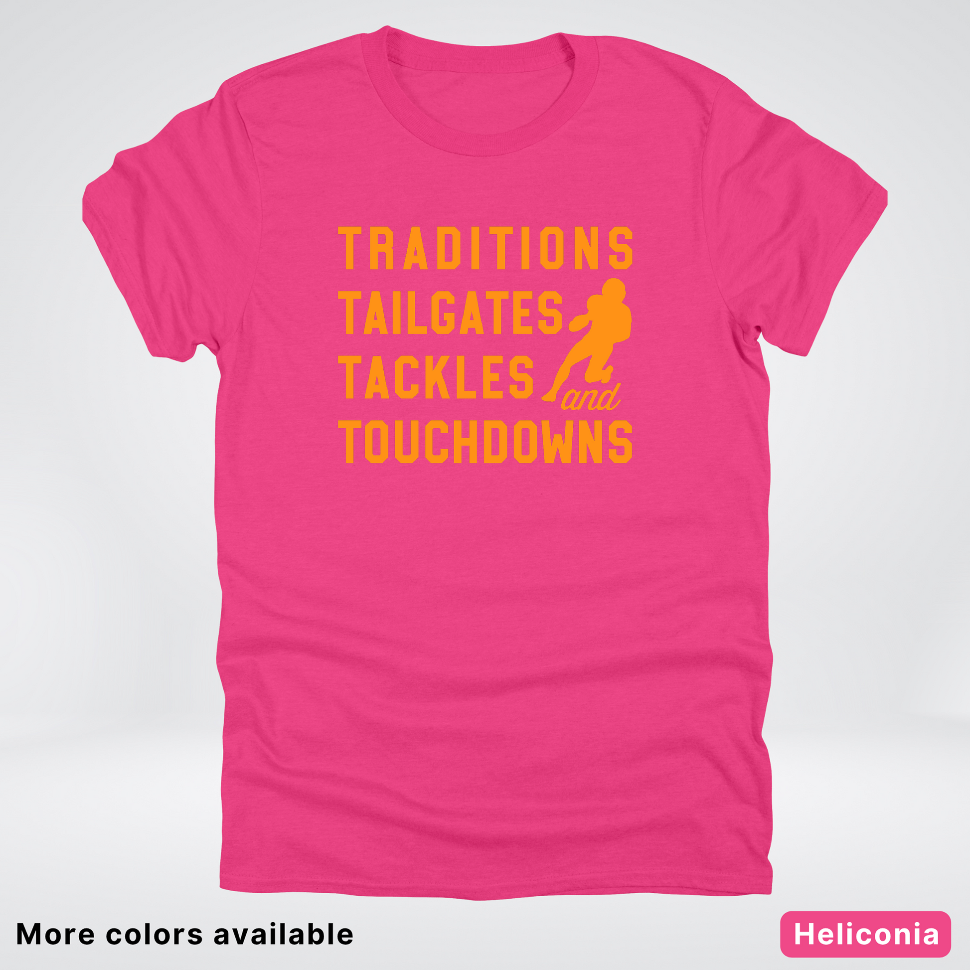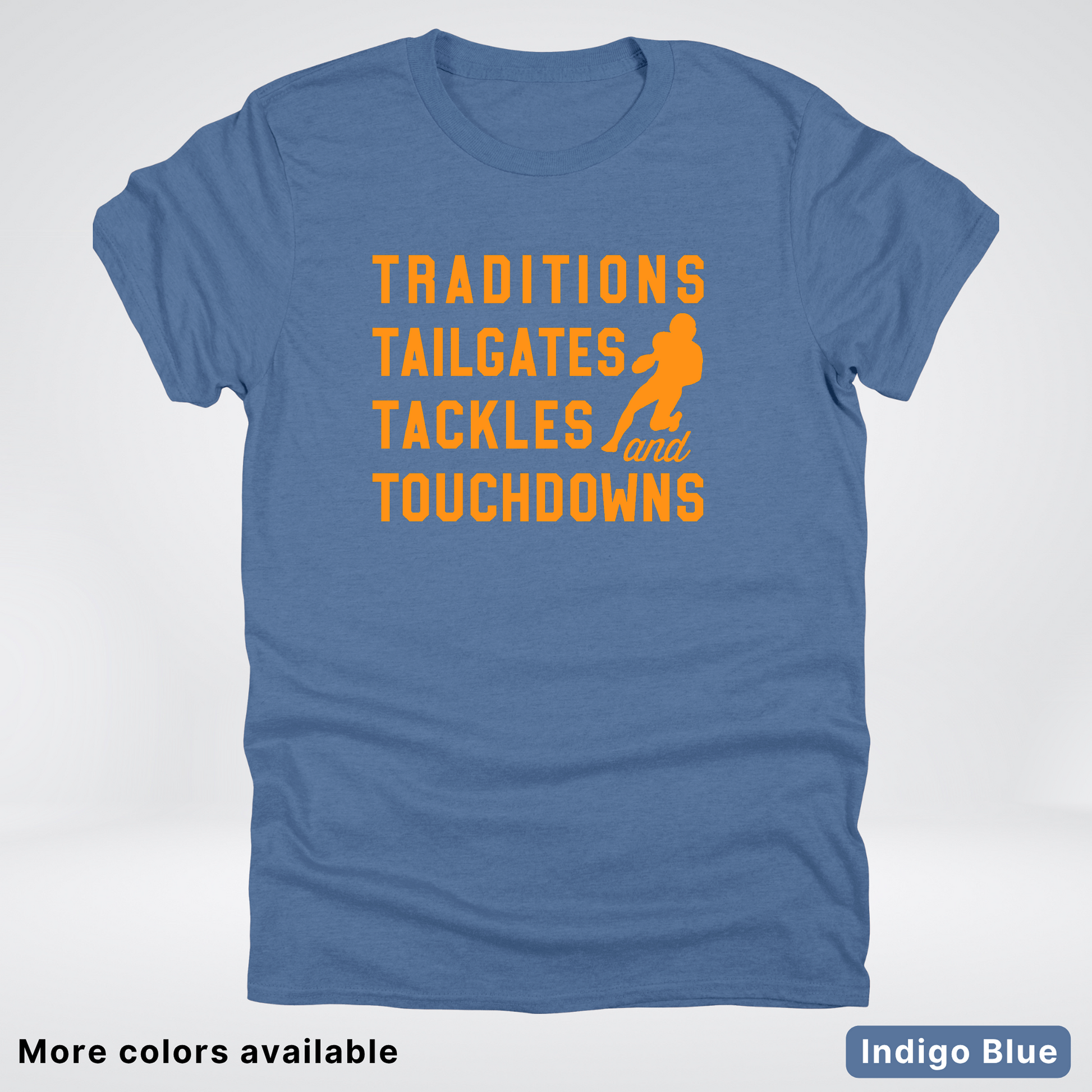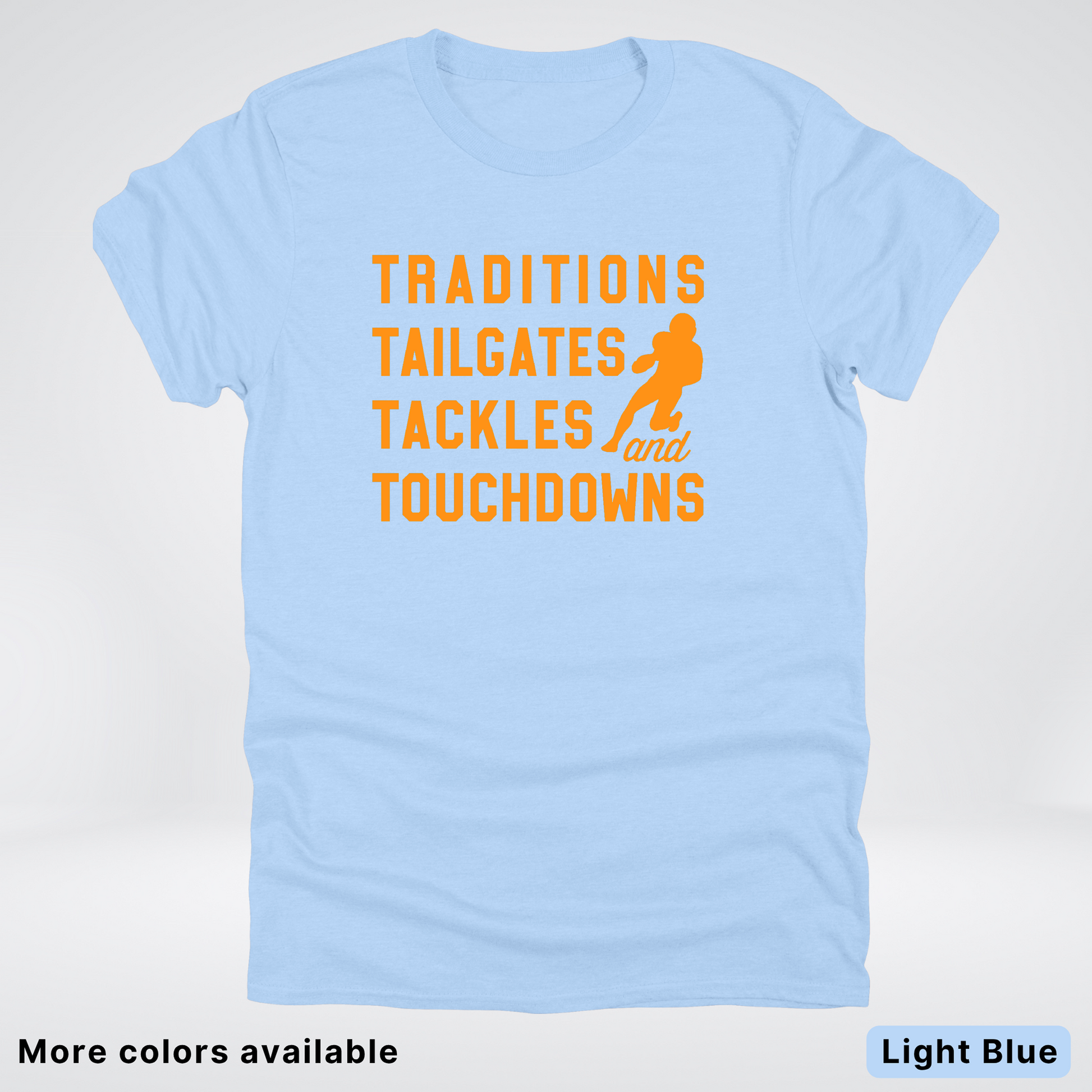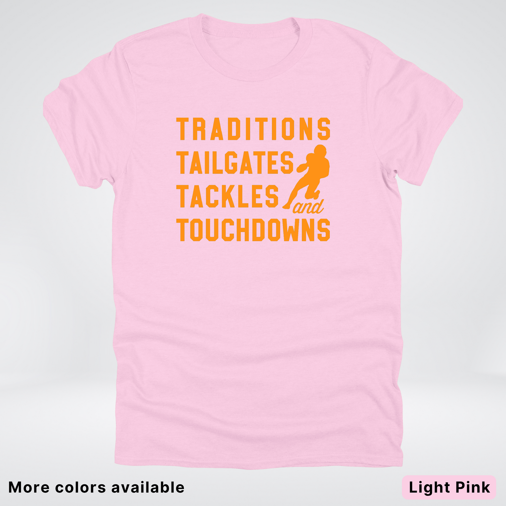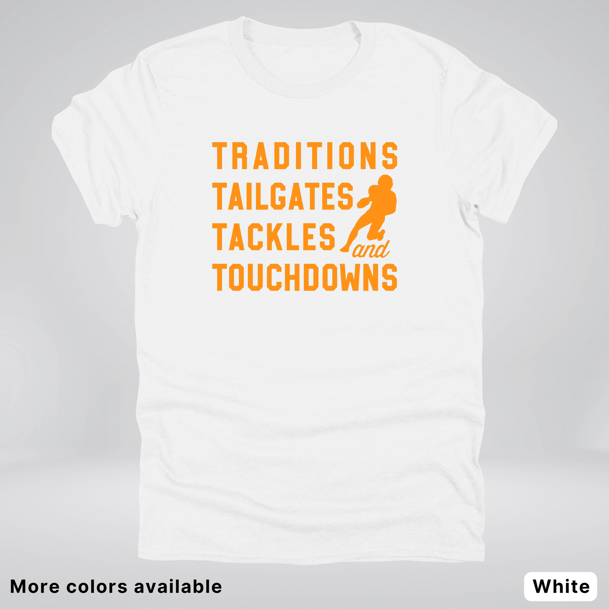 Traditions Tailgates Tackles and Touchdowns – Orange Design - Football T-Shirt