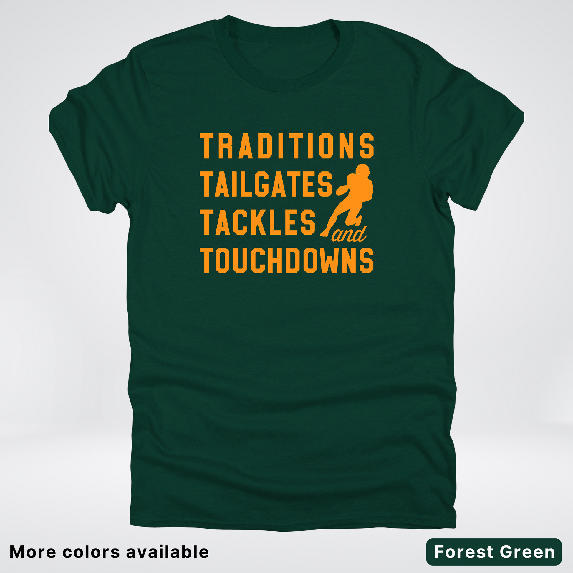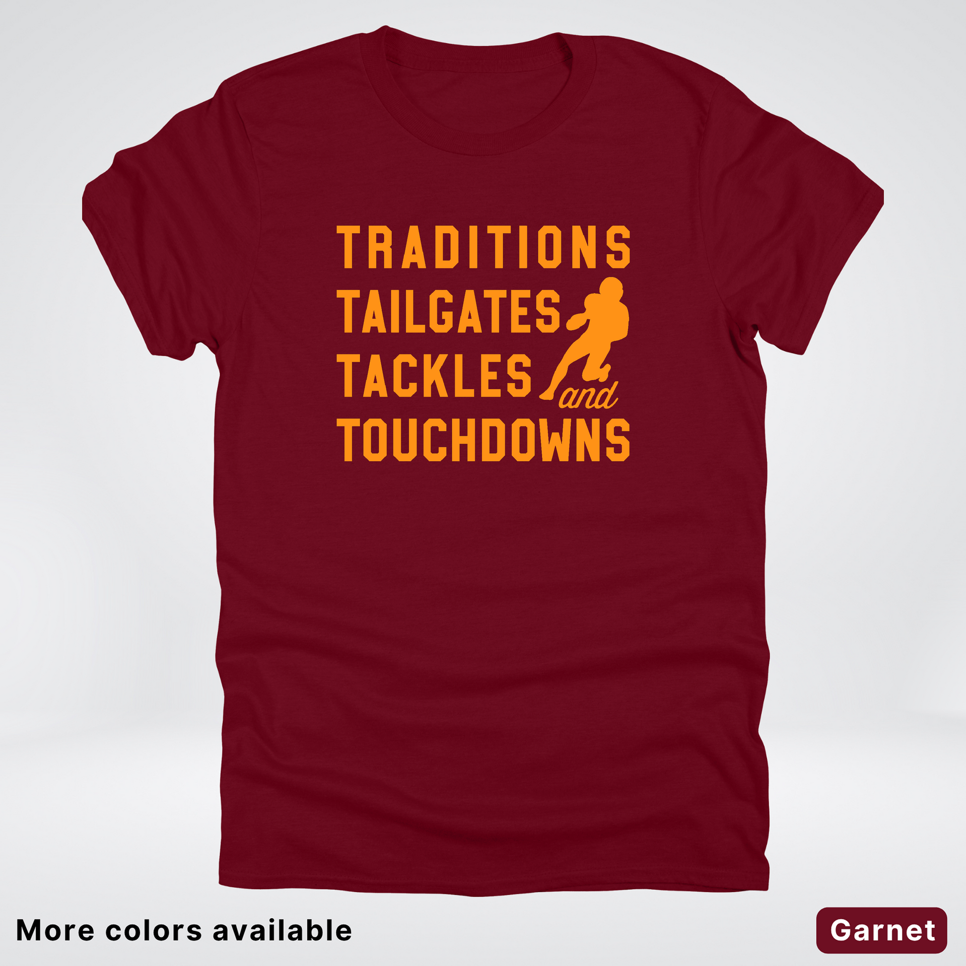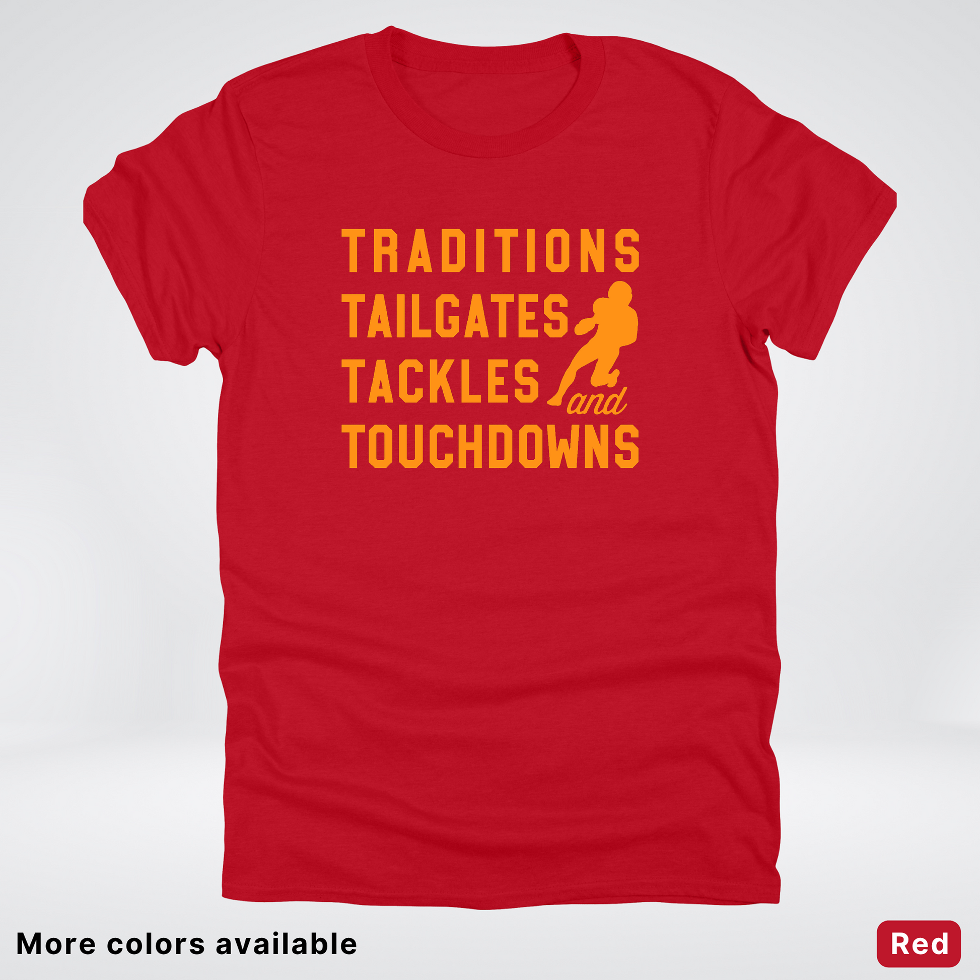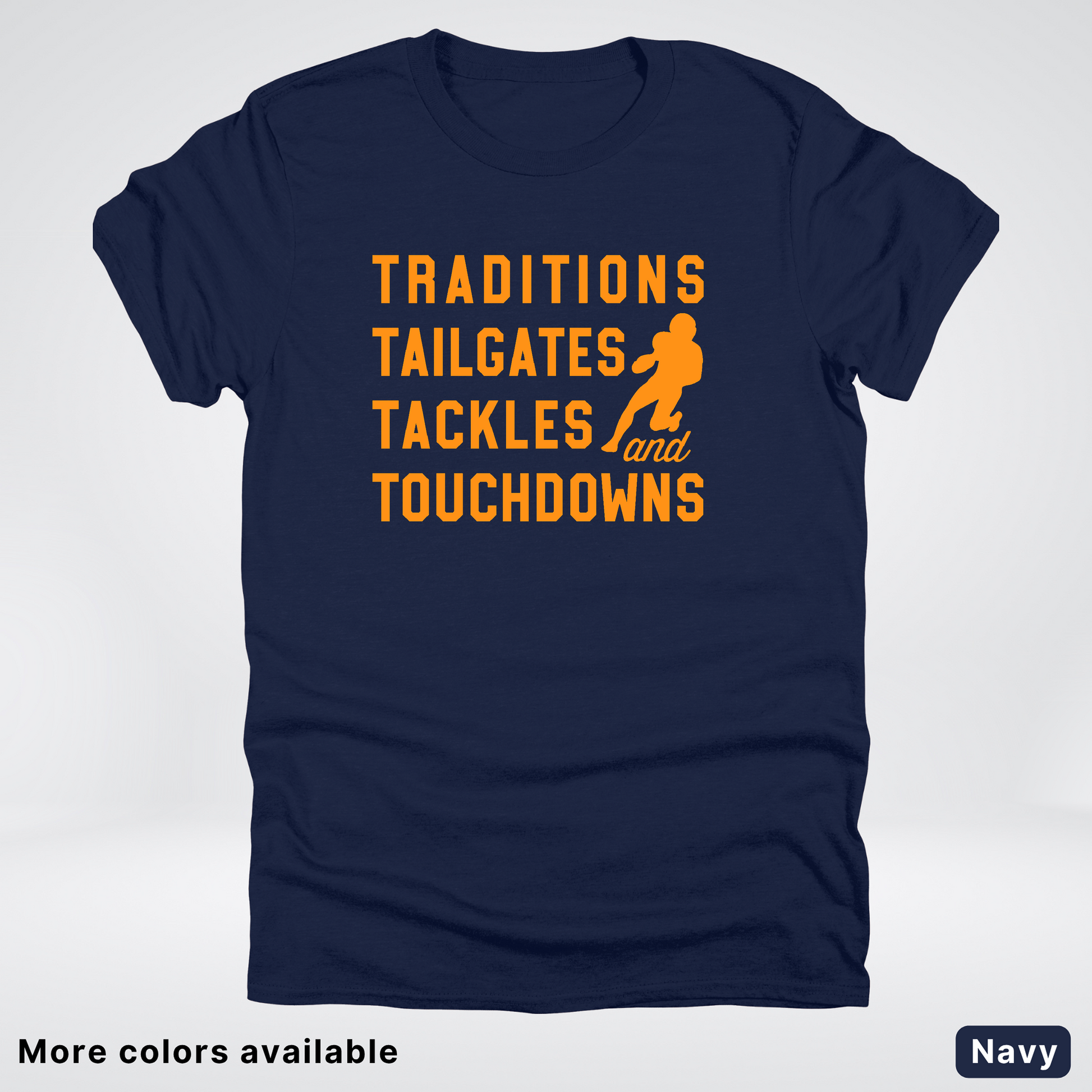 Traditions Tailgates Tackles and Touchdowns – Orange Design - Football T-Shirt