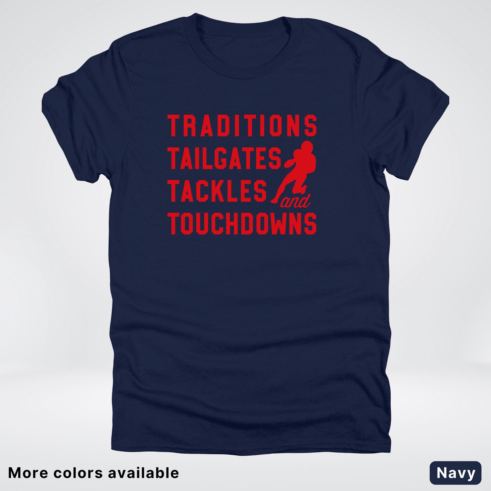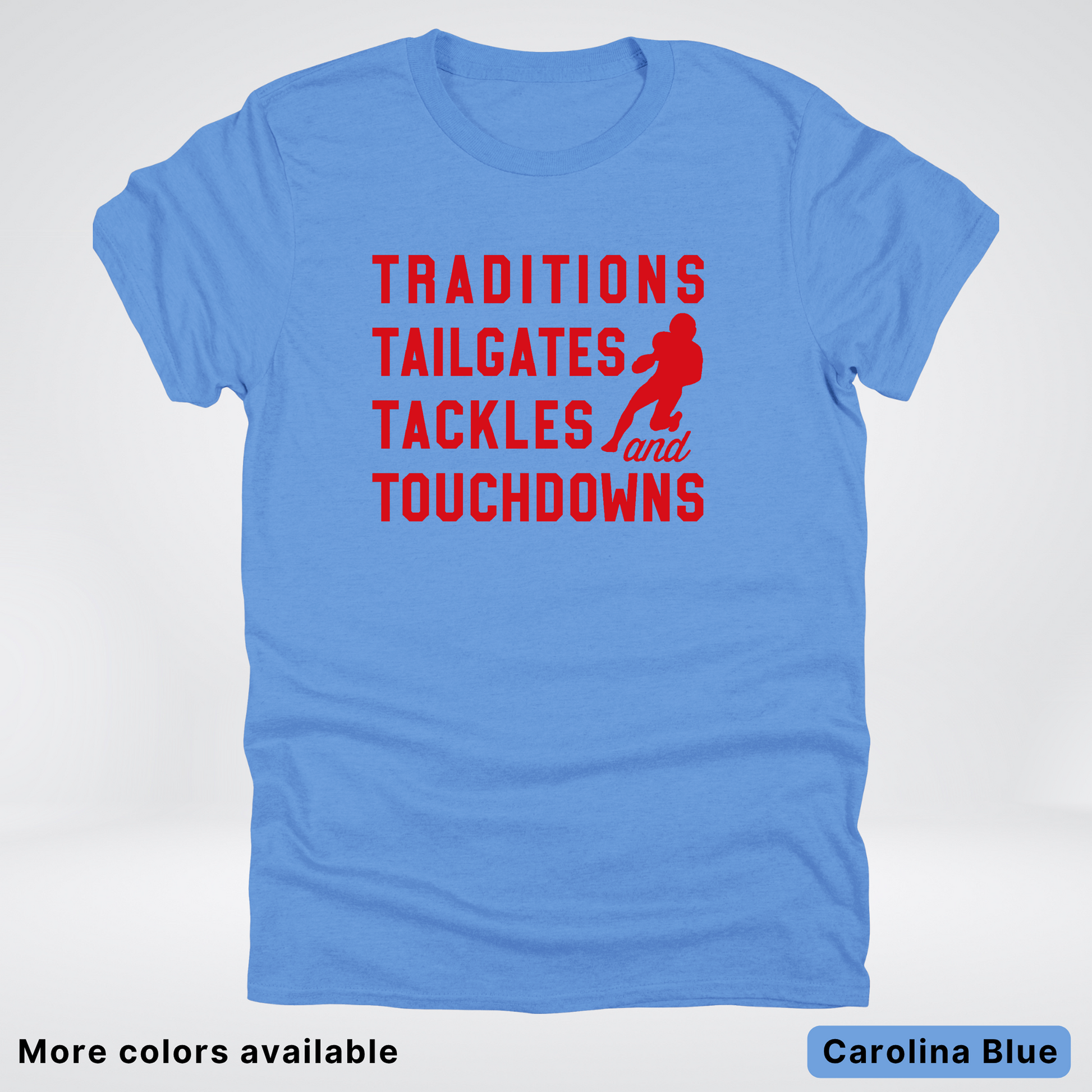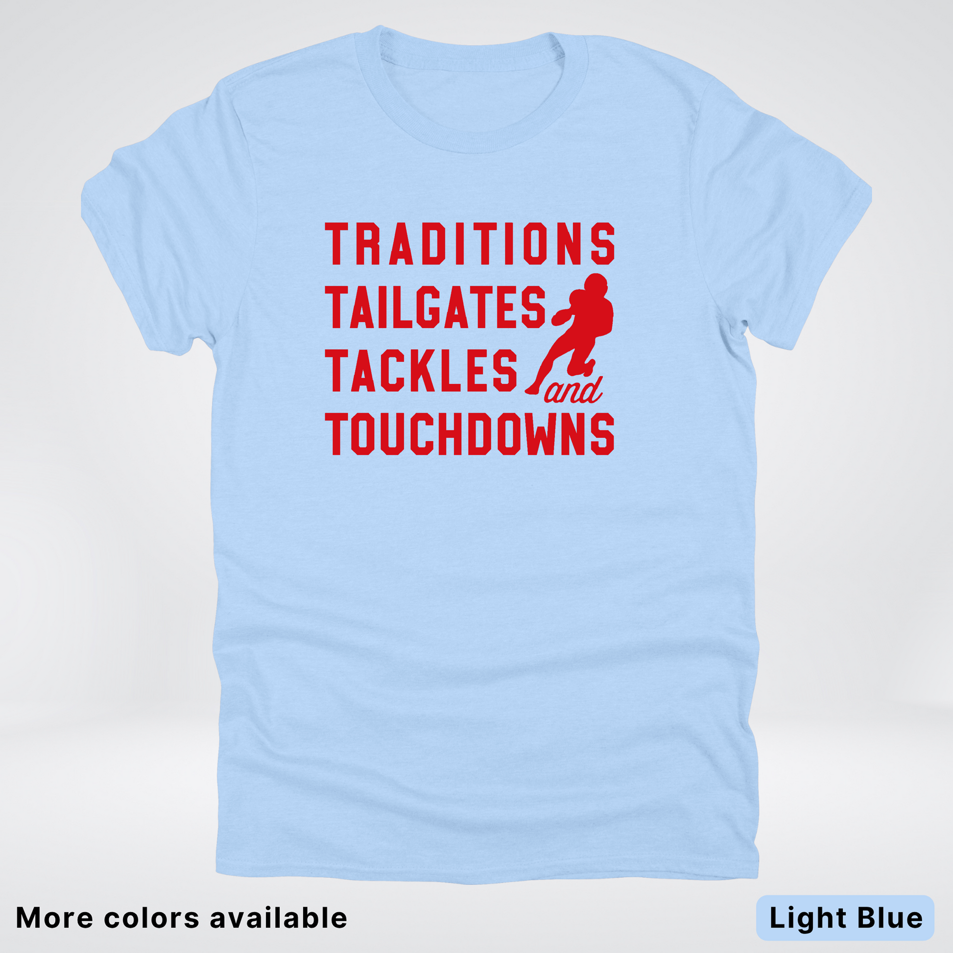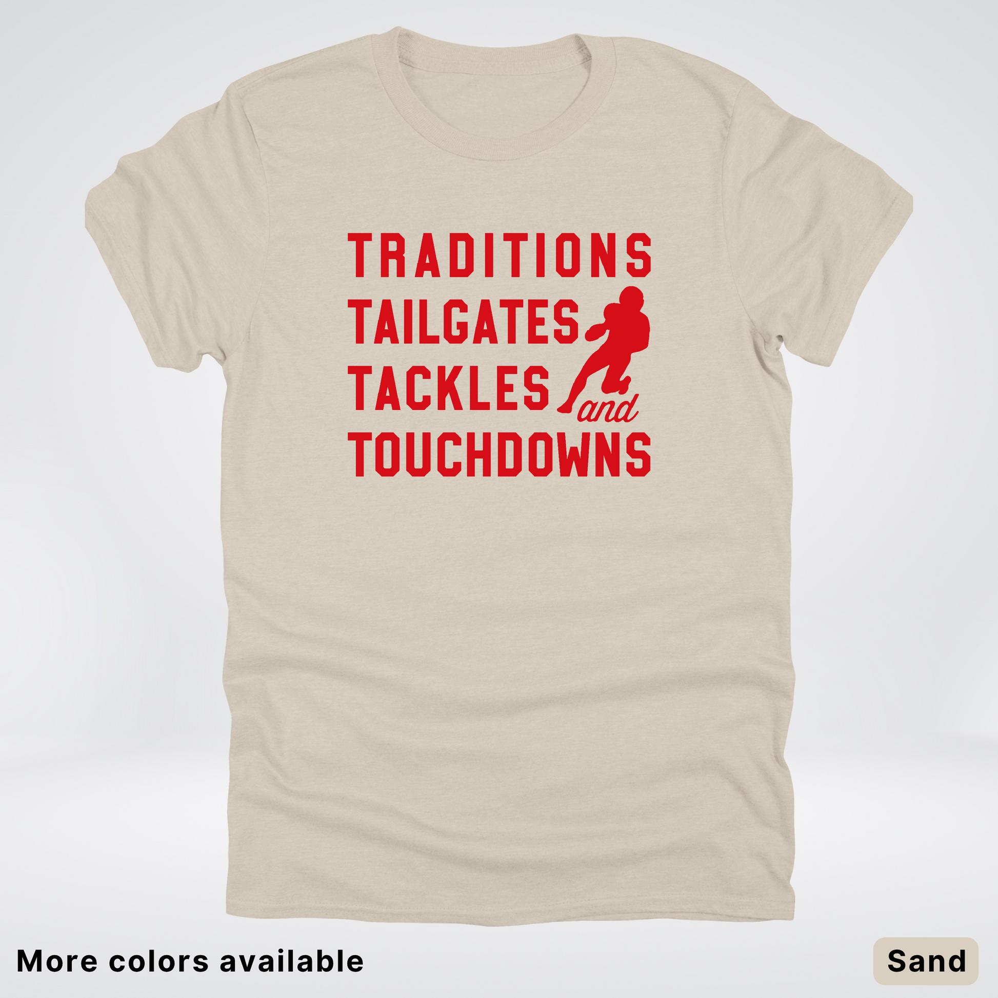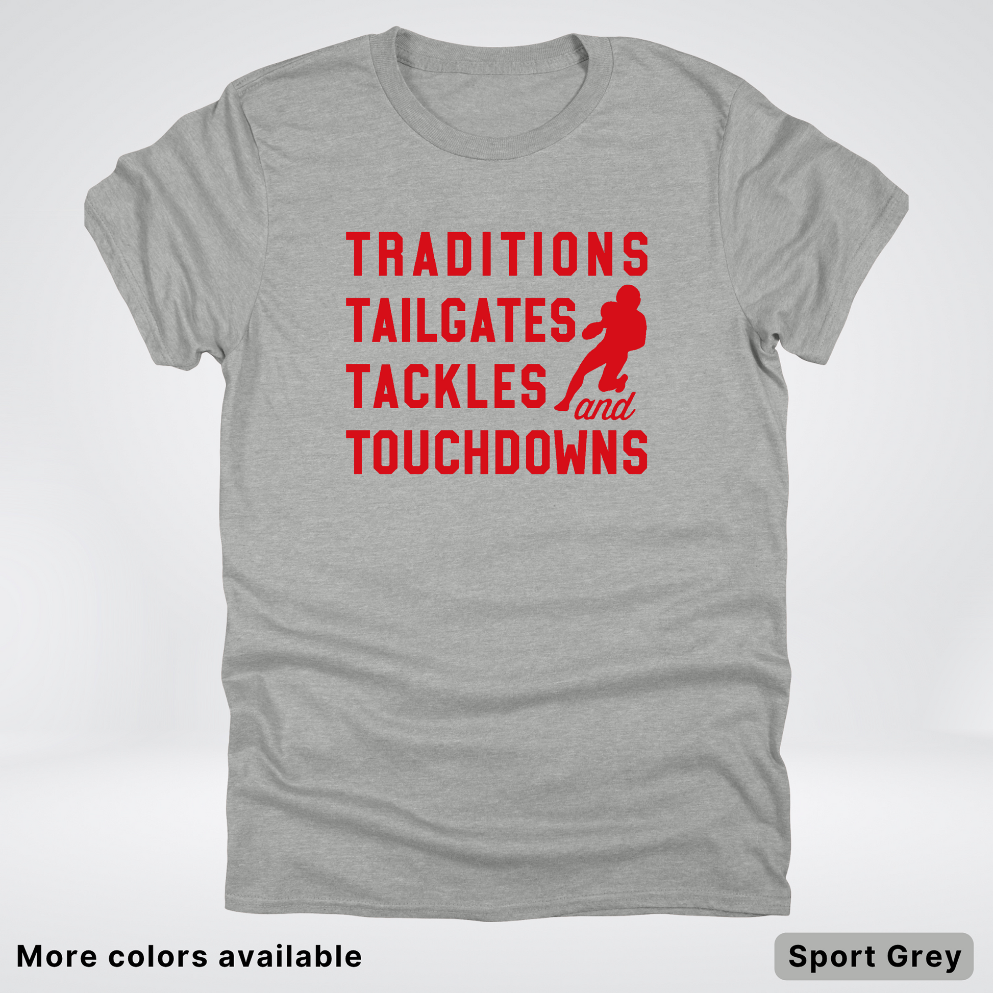 Traditions Tailgates Tackles and Touchdowns - Red Design - Football T-Shirt